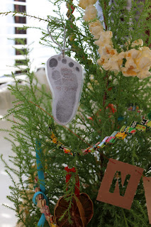 Baby's first Christmas ornament! Cordelia's foot print from her 3 day appointment, photocopied and laminated with her name and birthday written on the back.